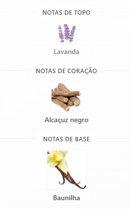 Família olfativa: Oriental Fougère Nota de topo: Lavanda Nota de coração: Alcaçuz Negro Nota de fundo: Baunilha
