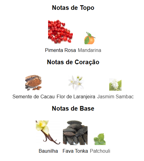 Família olfativa: Âmbar Floral Feminino Notas de topo: Pimenta Rosa, Mandarina Notas de coração: Semente de Cacau, Flor de Laranjeira, Jasmim Sambac Notas de fundo: Baunilha, Fava Tonka, Patchouli