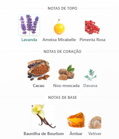 Família olfativa: Oriental Especiado Notas de topo: Lavanda, Ameixa Mirabelle e Pimenta Rosa Notas de coração: Cacau, Noz-moscada e Davana Notas de fundo: Baunilha de Bourbon, Âmbar e Vetiver