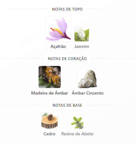 A abertura revela um frescor luminoso, conduzindo a um coração rico e sedutor, onde o âmbar rouba a cena com sua profundidade quente e suave. A base amadeirada complementa o perfume com toques de especiarias e uma doçura sutil, garantindo um rastro duradouro e elegante.
